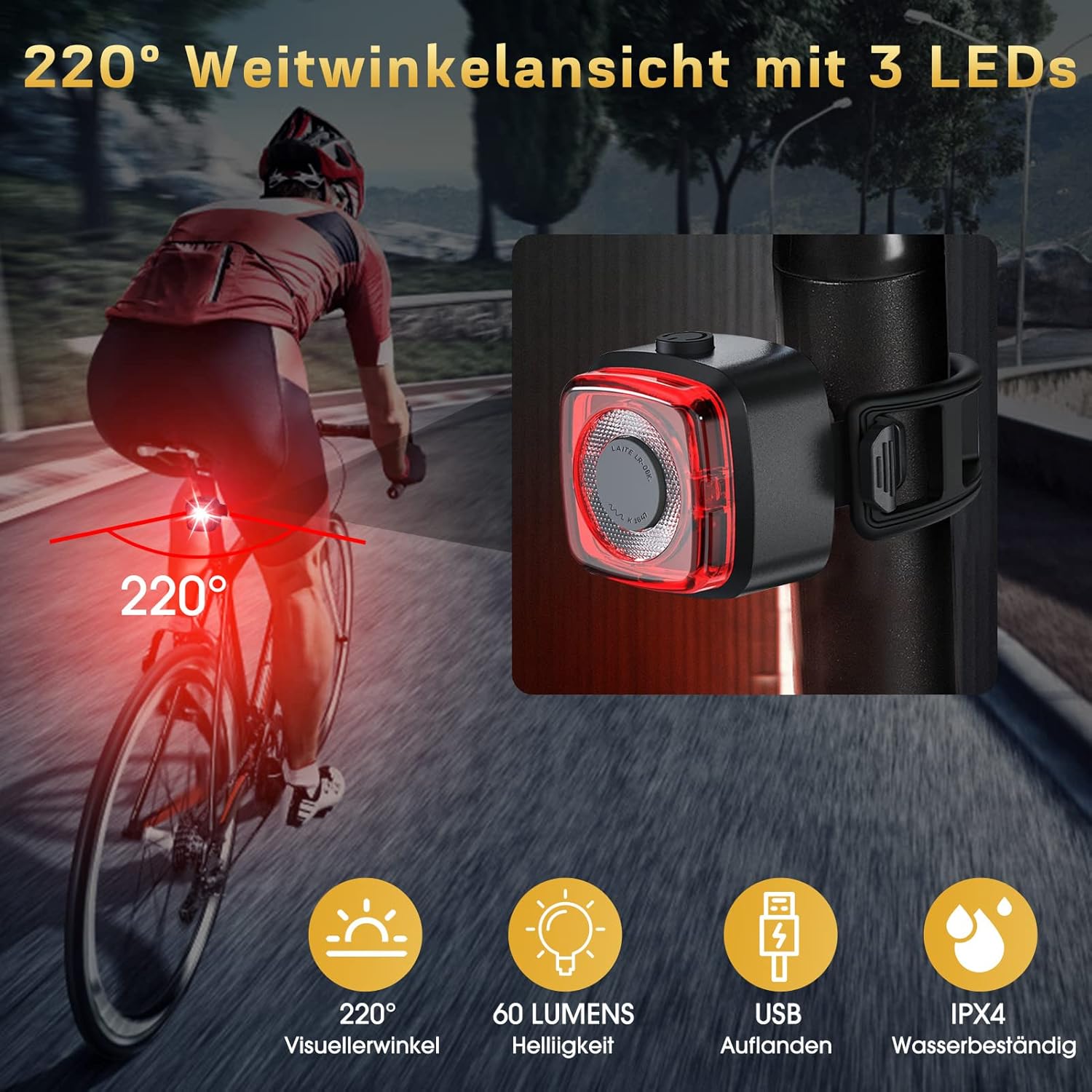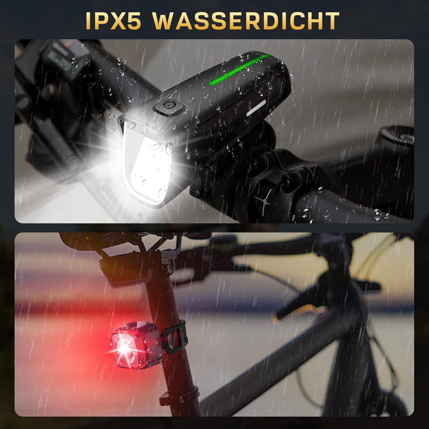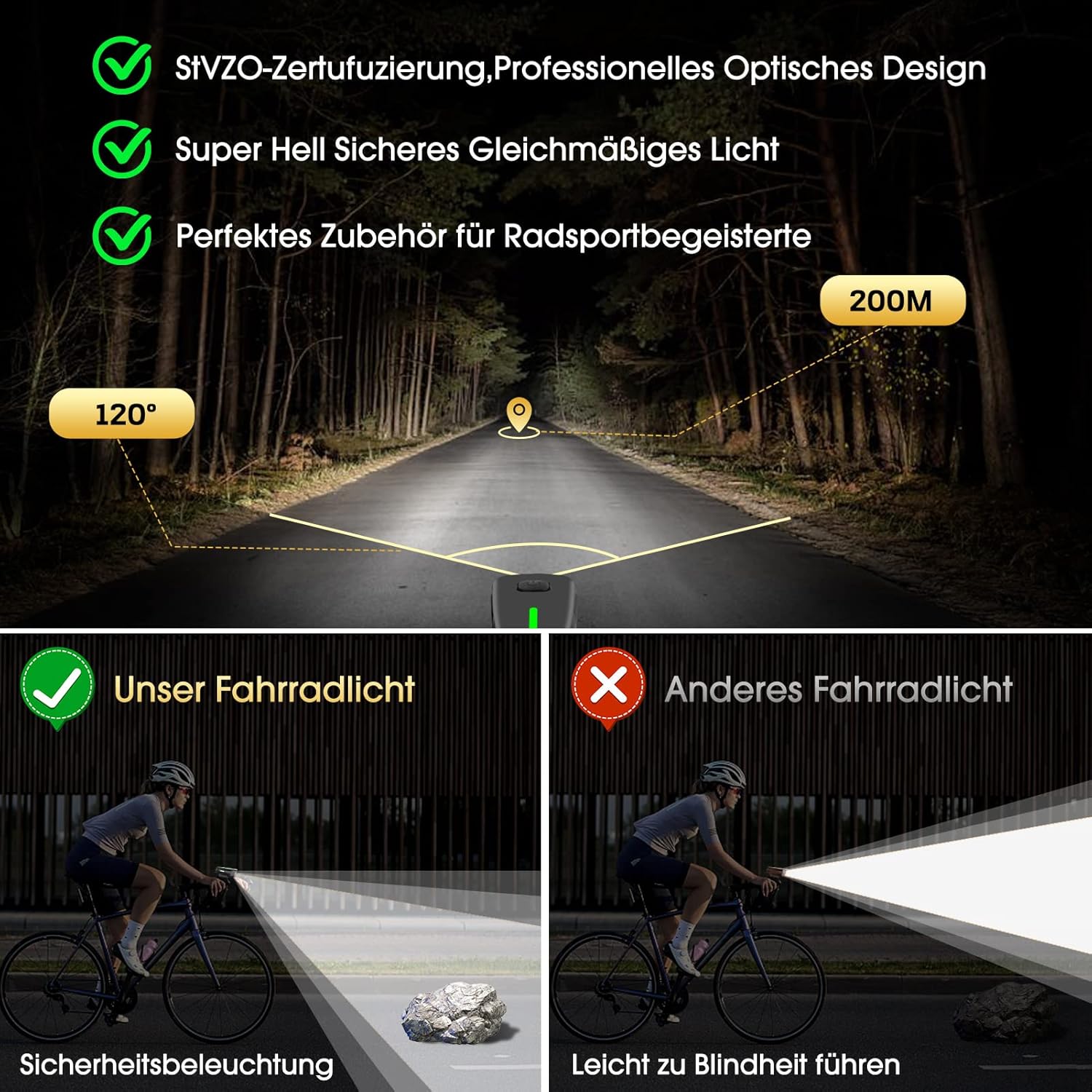 Professionelle Zertifizierung, BlendschutzdesignUnsere Fahrradlicht Set hat die StVZO-Zertifizierung bestanden und entspricht der deutschen Straßenverkehrsordnung. Blendfreies optisches Design, das Fußgänger und andere Radfahrer nicht stört. Die auffälligen roten Rücklichter fahrrad warnen jedes Fahrzeug, das von hinten kommt, auf Ihre Anwesenheit, bieten Ihnen Rundumschutz und machen Ihre Fahrt sicherer.