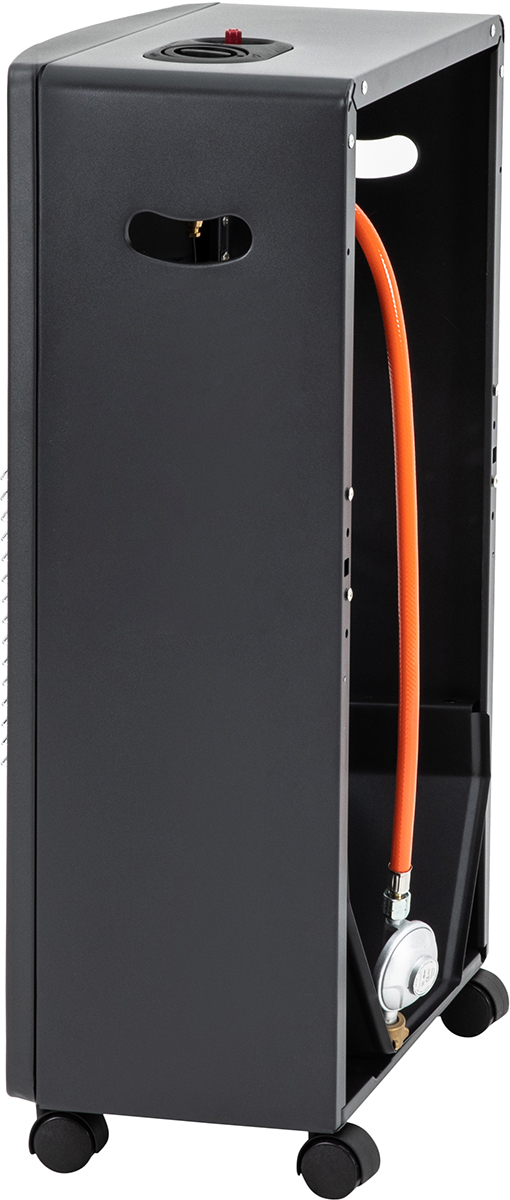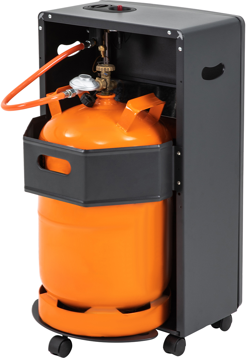 Lieferumfang: Inferno GH100, Gasschlauch und Druckregler 50 mbar, Rollen, Bedienungsanleitung, Montagematerial