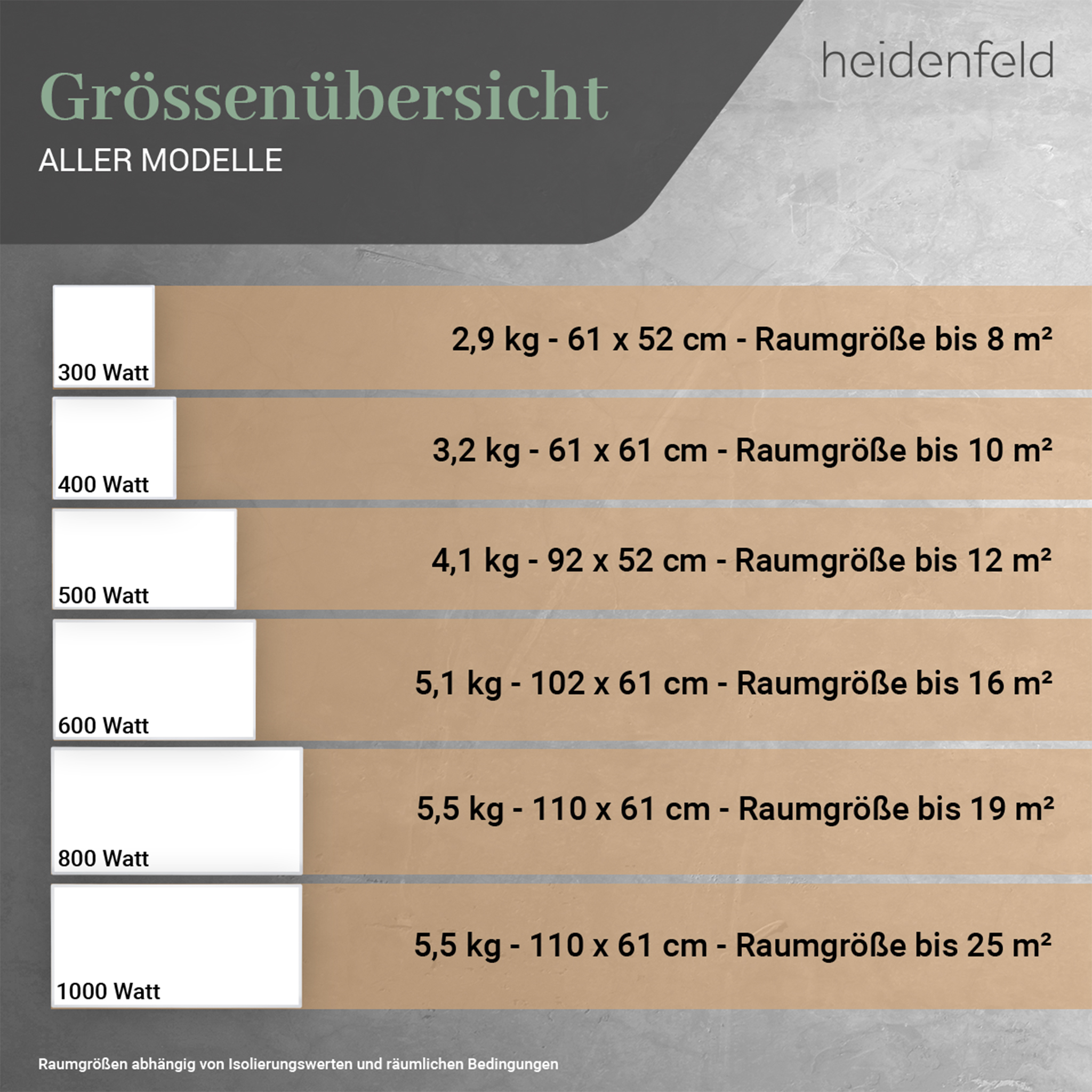 Sie wollen in Sachen Heizen eine neue Richtung einschlagen? Eine mit Strom betriebene Infrarotheizung ist eine gute Alternative zur Nutzung fossiler Energieträger wie Öl oder Gas. Egal ob Sie vor einer Neuinstallation oder einer Umrüstung stehen: Die Heidenfeld Infrarotheizung HF-HP100-3 ist im Handumdrehen im ganzen Haus angebracht. Dank des integrierten Steckdosenthermostats stellt sich auf Knopfdruck Ihre Wohlfühltemperatur ein. Die intelligente Fenster-Offen-Erkennung verhindert unnötigen Energieverbrauch. Die Gewährleistung von einer 10-jährigen Garantie bringt die Langlebigkeit dieses Heizsystems zum Ausdruck. Diese Infrarotheizung gibt es in sechs Varianten – bei dieser Auswahl finden auch Sie das passende Modell für jeden Ihrer Räume. Schlicht und harmonisch fügt sich der Infrarot-Heizkörper in Ihre Einrichtung ein.