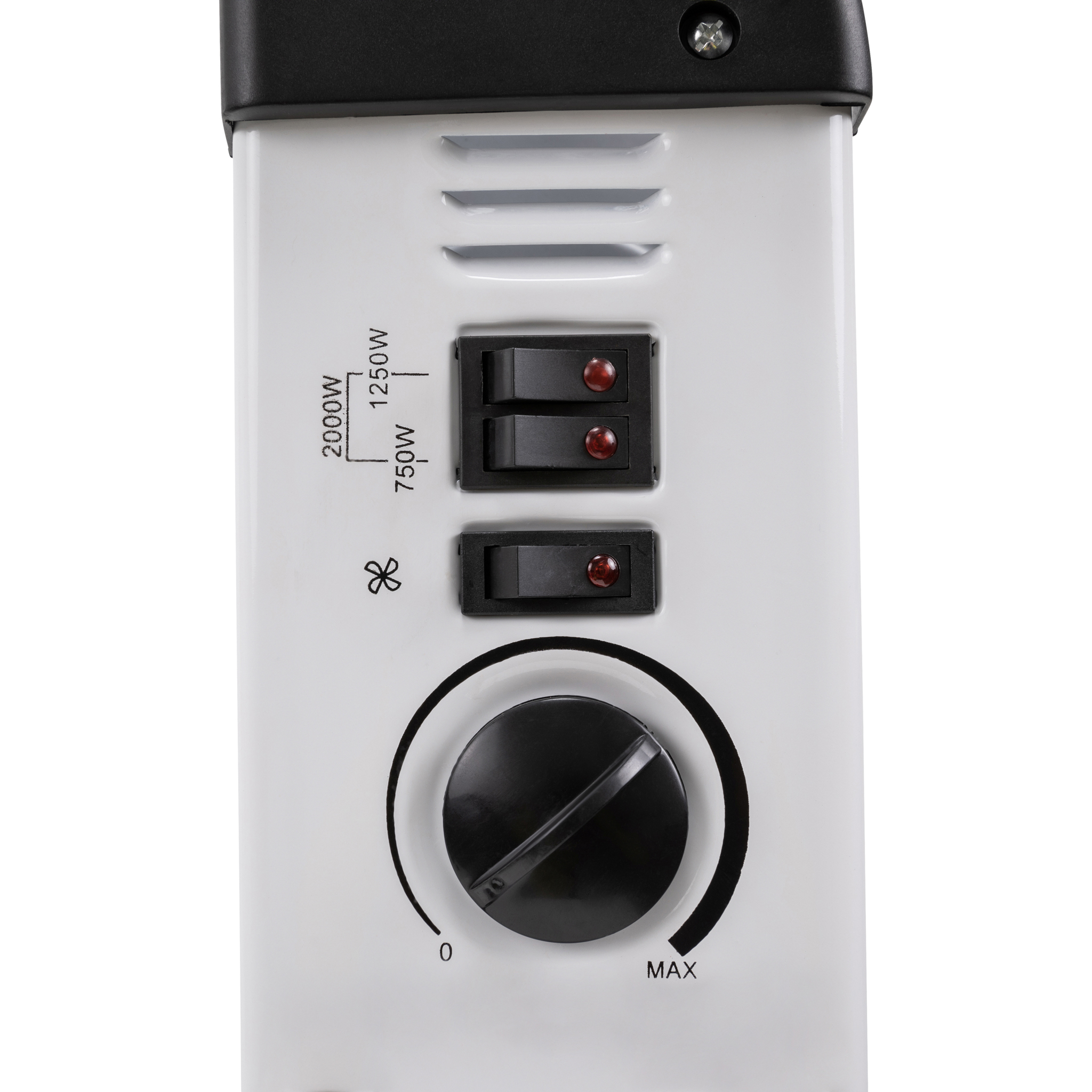 Bedienfeld: Heizstufe, Ventilation, stufenlose Thermostatregelung