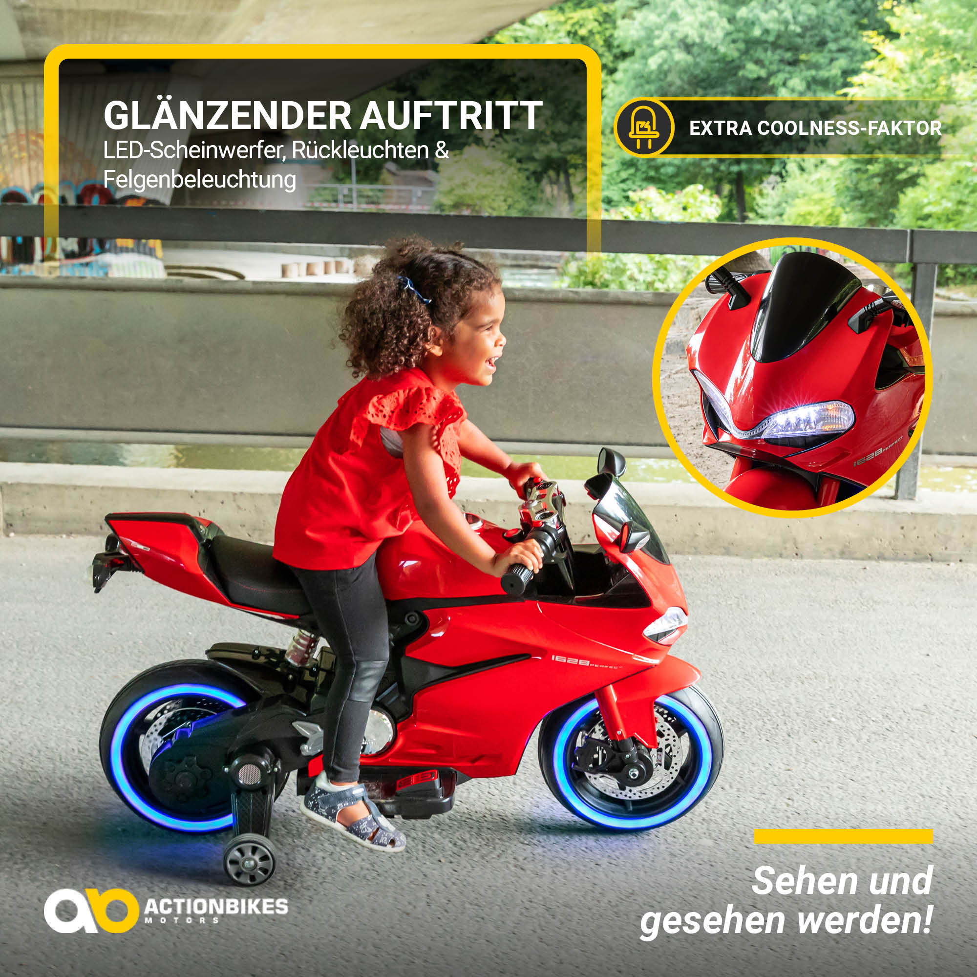 Einmal wie ein echter Rennfahrer durch die Gegend düsen – dieser Wunsch wird jetzt auch für Ihre Kleinsten wahr! Das Kindermotorrad 1299SS bietet echten Spielspaß auf zwei oder vier Rädern. Von drei bis sechs Jahren machen Kids erste Erfahrungen mit diesem besonders authentischen Kindermotorrad. Das vielseitige Soundmodul mit MP3, USB-Port und vielem mehr untermalt jede Ausfahrt mit der persönlichen Lieblingsmusik. Mit der Soft-Start-Funktion ist jedes Anfahren ein Kinderspiel – ganz ohne ruckartige Bewegungen. Zwei Motoren mit insgesamt 70 Watt bieten eine Geschwindigkeit von 3–6 km/h. Perfekt, um den Einstieg in die Welt der motorisierten Fahrzeuge zu meistern. Lassen Sie jetzt Träume wahr werden: mit dem Kindermotorrad 1299SS!